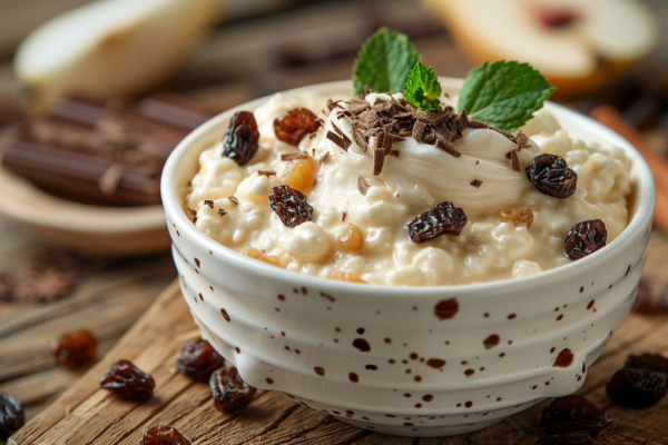 Подготовьте 400 г творога, 100 мл натурального йогурта, 2 ст. л. изюма и 1 грушу. Замочите изюм в тёплой воде на 5 минут, слейте. Измельчите грушу блендером в пюре, соедините с протертым творогом и йогуртом, добавьте изюм. Взбейте до кремовой текстуры, разложите по мискам. Украсьте тертым шоколадом (горьким, 10 г) или веточкой мяты. Калорийность — 220 на порцию, много кальция и клетчатки. Лайфхак: для шоколадного вкуса добавьте какао-порошок без сахара. Этот десерт из творога хранится в холодильнике до 2 дней — готовьте заранее.