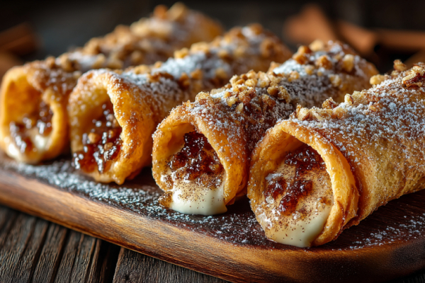 Для посыпки рублю 200 г грецких орехов и смешиваю их с пятью столовыми ложками сахара и столовой ложкой корицы. Подошедшее тесто делю на 10–12 частей, каждую раскатываю в длинную тонкую полоску, смазываю растопленным сливочным маслом и щедро посыпаю орехово-сахарной смесью. Наматываю полоски на конусные формы или плотно скрученные конусы из фольги, сверху ещё раз смазываю маслом и обваливаю в посыпке. Выпекаю при 180 °C 15–20 минут до насыщенного золотистого цвета, затем даю немного остыть, аккуратно снимаю с форм и наполняю яблочной начинкой.