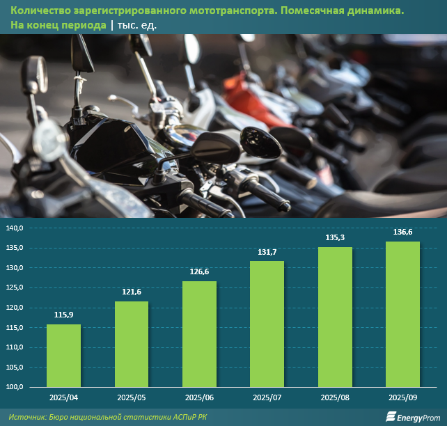 По итогам сентября текущего года в РК зарегистрировано 136,6 тыс. мотоциклов, мопедов, квадроциклов и трициклов.