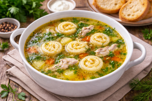Когда обычный куриный суп с лапшой уже надоел, можно приготовить более интересный вариант. В этом рецепте вместо привычной вермишели в суп добавляют нежные сырные «улитки». Они получаются мягкими, ароматными и делают блюдо намного сытнее и вкуснее. Такой суп отлично подходит для семейного обеда и готовится из простых продуктов.