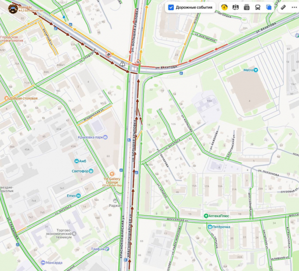 Авария на перекрестке улиц Краснококшайская и Большая Крыловка привела к большим пробкам в Кировском районе Казани. Движение осложнено на этих двух улицах, а также на улице Вахитова.
