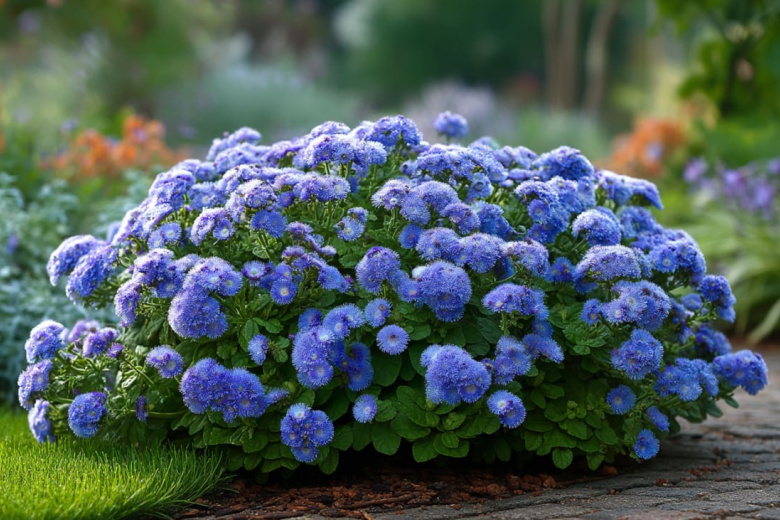 Агератум невероятно универсален: низкорослые сорта (15–30 см) идеальны для бордюров и ковровых клумб, а более высокие (до 60–70 см) прекрасно смотрятся в миксбордерах и на срезку.