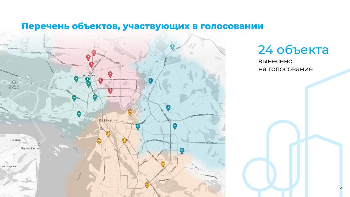 В список для голосования в этом году включены 24 объекта. Перечень сформирован на основе предложений жителей. Локации распределены по городу равномерно: по три объекта представлены в Приволжском, Авиастроительном, Московском, Ново-Савиновском и Кировском районах, и сразу шесть – в Советском.