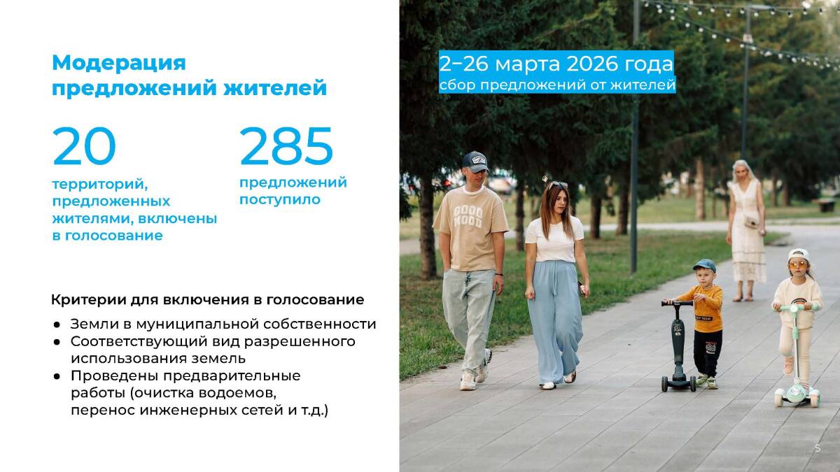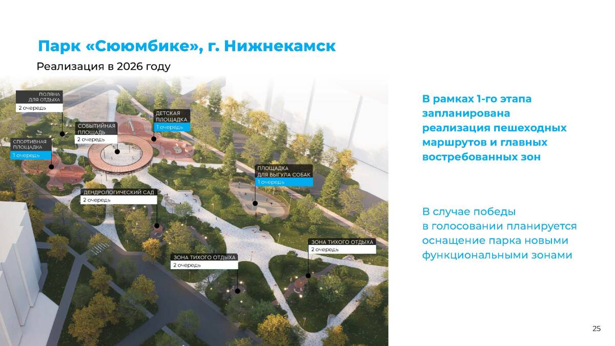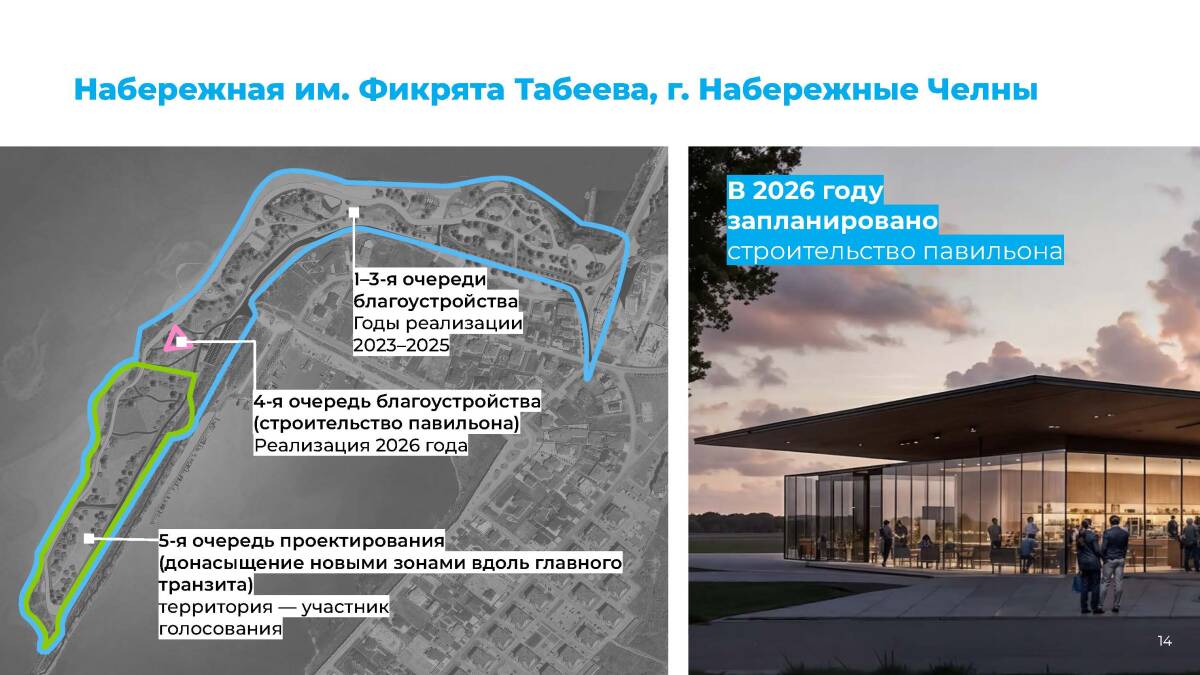«Мы планомерно работаем над этой зоной, начиная с парка «Прибрежный». Пятая очередь должна стать финальным аккордом, который свяжет реализованные участки в единую систему. В 2026 году на территории четвертой очереди появится масштабный павильон для проведения городских праздников и юбилеев, а голоса жителей в этом году помогут донасытить транзитную зону новыми функциональными площадками в 2027-м», – подчеркнула Наиля Нагуманова.