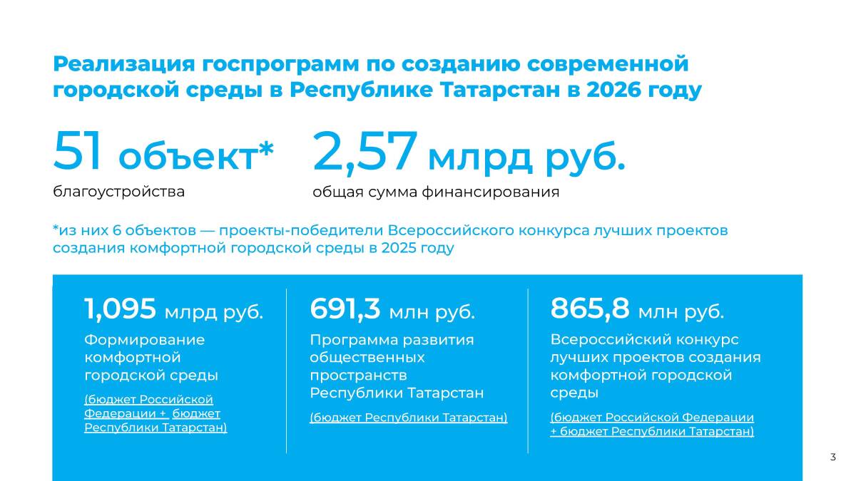 «Республика ежегодно участвует во Всероссийском конкурсе лучших проектов создания комфортной городской среды. За восемь лет финансирование из федерального бюджета получили 55 проектов, 42 из которых уже завершены и 13 планируем завершить в этом году», – заметил Айзатуллин.