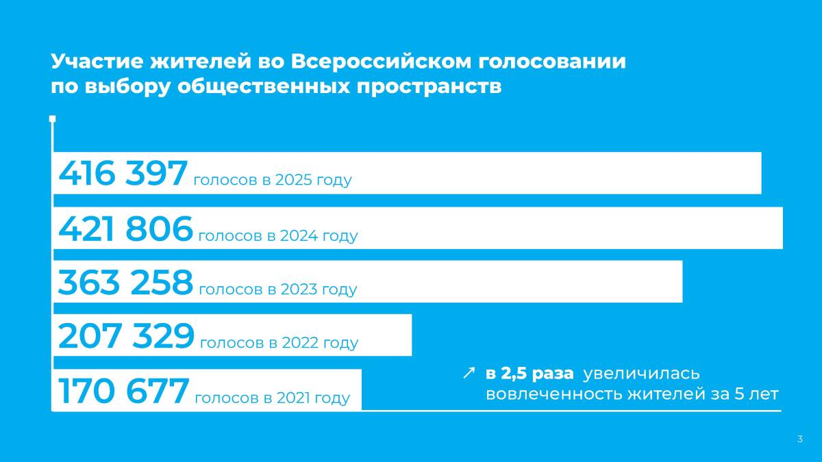С каждым годом интерес жителей к выбору территорий растёт. За последние пять лет вовлеченность татарстанцев увеличилась в 2,5 раза: если в 2021 году проголосовали 170 тысяч человек, то в прошлом году своё мнение выразили уже более 416 тысяч жителей республики, сообщила директор фонда «Институт развития городов РТ» Наиля Нагуманова.