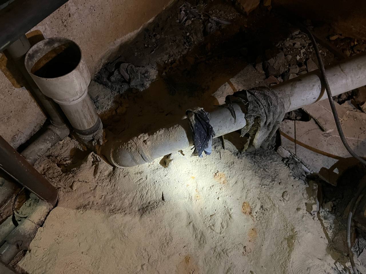 Территорию рядом с трубой обсуждаемого третьего подъезда сейчас засыпали опилками и хлоркой, чтобы устранить вылившиеся отходы и запах. Кроме того, сантехники оставили "находки", вытащенные в ходе прочистки.