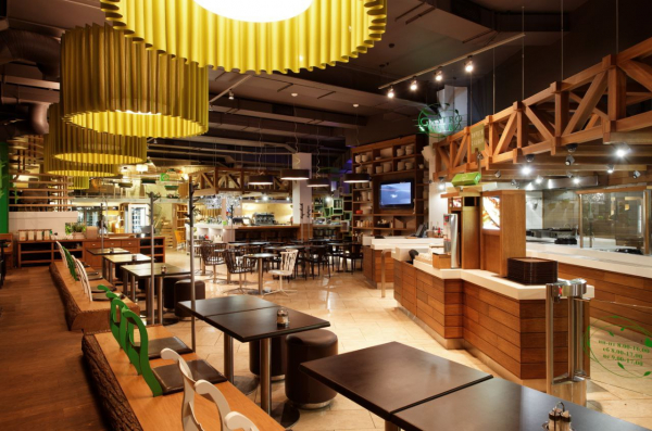 - Семейный ресторан «Дача» (1-й этаж). Вечером это центр семейного отдыха. Сценарии для детей здесь не «высосаны из пальца»: детская барная стойка, спецсанузел, многоуровневая игровая. Атмосферу создают живые птицы и символ заведения — добродушный кот-хозяин. Днём работает формат быстрых деловых обедов через технологичную зону ФРИ-ФЛО: гость выбирает свежее блюдо через фото-монитор, не ожидая заказа.