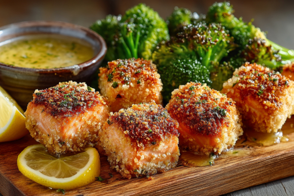 Беру 500 граммов филе красной рыбы (лосося, форели), очищаю от кожи и костей, нарезаю на аккуратные кубики размером примерно 2×2 см. В миске смешиваю рыбу с 1,5 чайными ложками паприки, половиной чайной ложки сушеного базилика, 2 столовыми ложками оливкового масла и солью по вкусу. Осторожно перемешиваю, чтобы не поломать кусочки. Даю немного промариноваться (5-10 минут). 50 граммов сухарей панко высыпаю на тарелку. Каждый кусочек рыбы обваливаю в сухарях со всех сторон, слегка прижимая, чтобы панировка хорошо прилипла. Выкладываю наггетсы на решетку аэрогриля или на противень, застеленный пергаментом. Готовлю в аэрогриле при 190°C 8-10 минут до румяной, хрустящей корочки. Если нет аэрогриля, можно в духовке с конвекцией на среднем уровне. Параллельно готовлю брокколи: 200 граммов соцветий сбрызгиваю оливковым маслом, посыпаю солью и паприкой, запекаю в аэрогриле при 190°C 6-8 минут до мягкости. Для соуса смешиваю в баночке или миске столовую ложку оливкового масла, сок половины лимона, 2 чайные ложки жидкого мёда, щепотку соли и мелко рубленную петрушку. Взбалтываю до лёгкого загустения. Подаю рыбные наггетсы и брокколи горячими, сдобрив лимонно-медовым соусом. Идеально с отварным рисом или киноа.