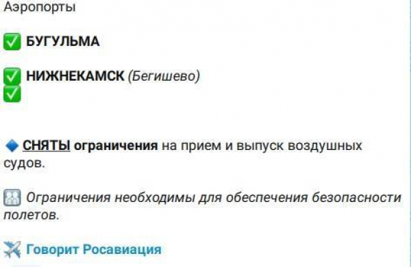 Для аэропортов Нижнекамска и Бугульмы сняты ограничения на приём и выпуск воздушных судов. Об этом сообщает Росавиация. Ранее возобновил свою работу аэропорт Казани.