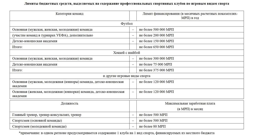 Утвердить прилагаемые лимиты бюджетных средств, выделяемых на содержание профессиональных спортивных клубов по игровым видам спорта", — говорится в документе.