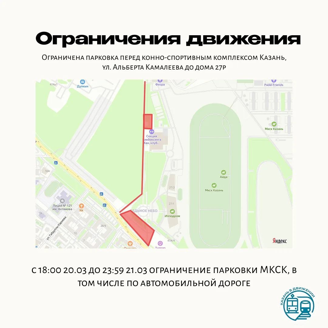 Кроме того, с 18 часов 20 марта и до 23:59 следуюшего дня ограничения на движение и парковку будут действовать на Проспекте Альберта Камалеева и на территории парковки у Международного конноспортивного комплекса «Казань».